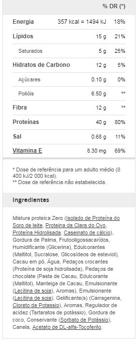 Ingredientes: Mistura de proteína [proteína de soro de leite isolada, proteína de clara de ovo em pó, proteína hidrolisada, caseinato de cálcio (contém leite), proteína isolada de soja], umectantes [glicerol (contém soja), maltitóis], gordura de palma, frutooligossacarídeos, soja extrusada, pedaços de chocolate [adoçante (maltitóis), massa de cacau, emulsificante: lecitinas (soja), cacau em pó com redução de gordura, aroma natural], aromatizantes, água, emulsificante: lecitinas (soja), agentes gelificantes (carragena, cloreto de potássio), cacau em pó com redução de gordura, conservante (sorbato de potássio), adoçante (sucralose), antioxidante (alfa-tocoferol)